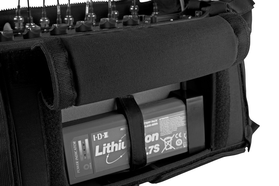 This MXC bag combines both the recorder and receiver compartments to form one ridged structural design. The new style of MXC provides a much stronger frame and offers greater support. The bag has two large pockets on either side, perfect for an NP1 type battery or left and right transmitter sends. Located within these pockets there are also additional transmitter attachment points.