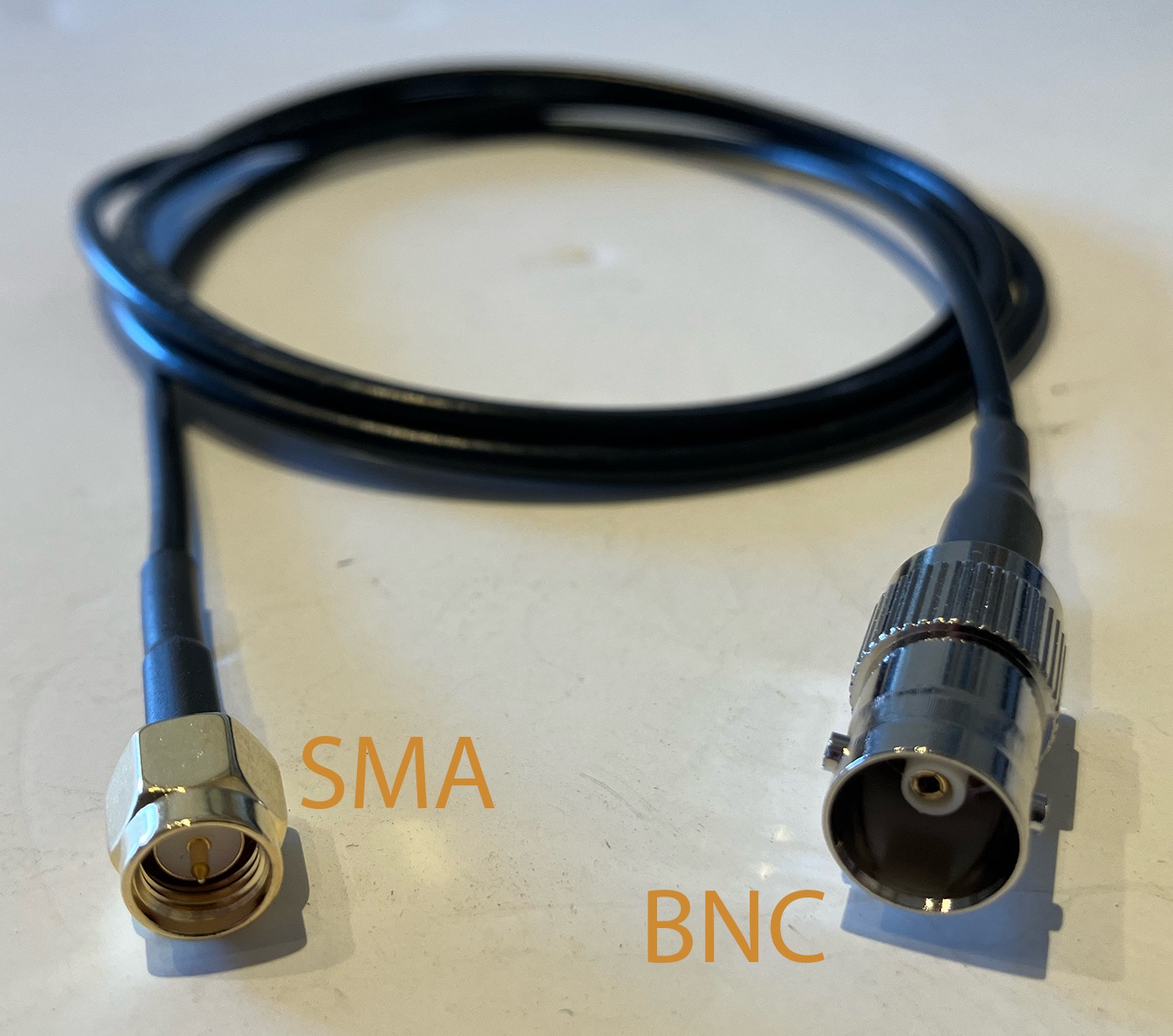 Cable extension lead, RG 174, 39 inch (1m). One side BNC Female connector, other side SMA Male connector.
