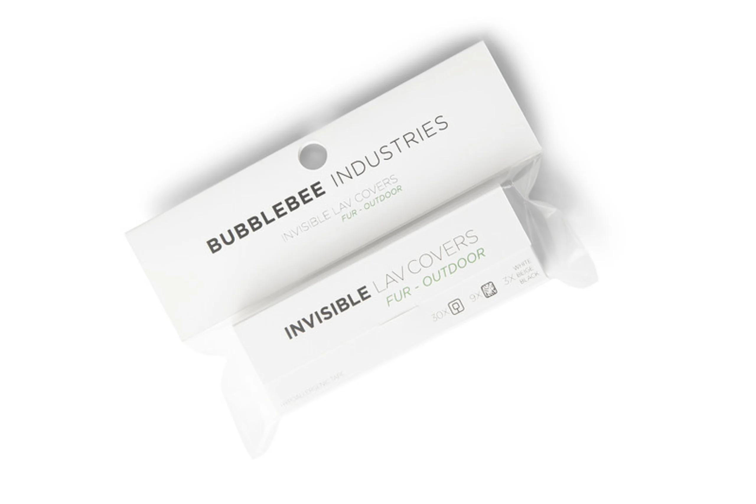 Each package of Invisible LAV Covers FUR OUTDOOR consists of 9 pieces of fur fabric in 3 colors: black, beige, and white, together with 30 pieces of Bubblebee Industries' high-quality Invisible LAV Tape.