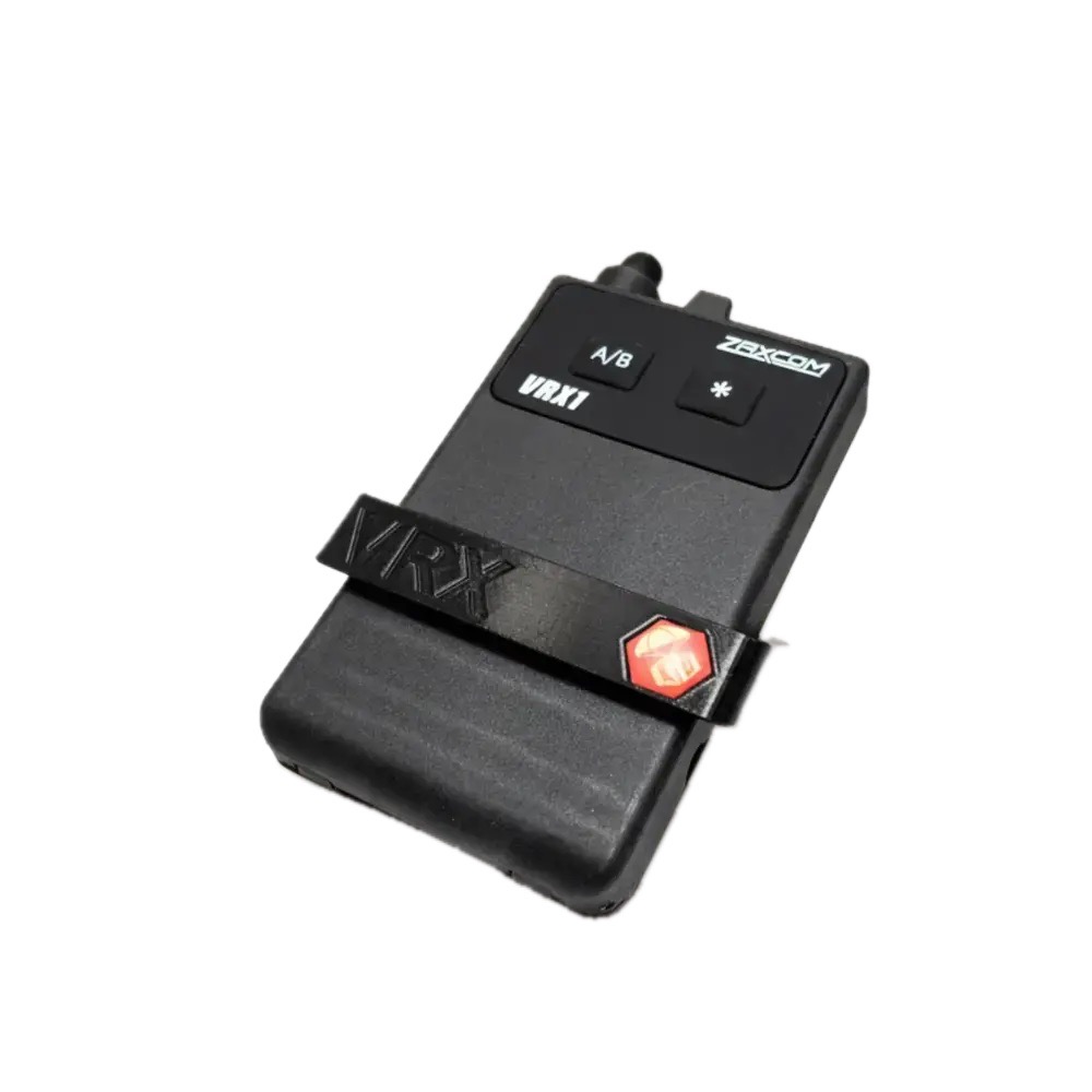 1/4" thread mount holder for Zaxcom VRX receivers; vertical or horizontal positioning, 3 mounting points and rear access to the battery compartment.