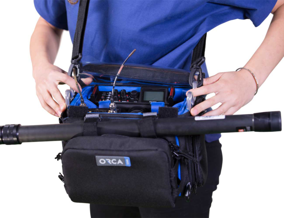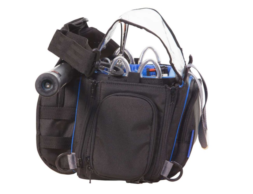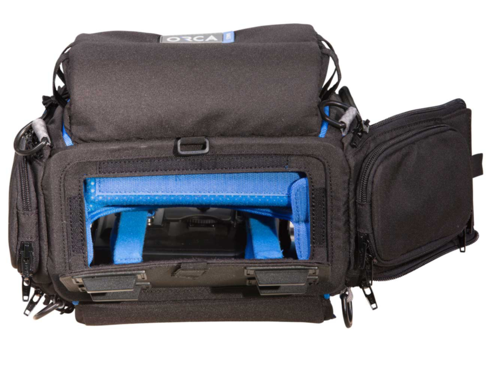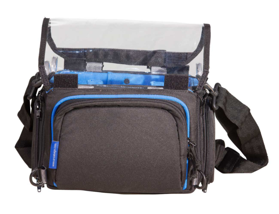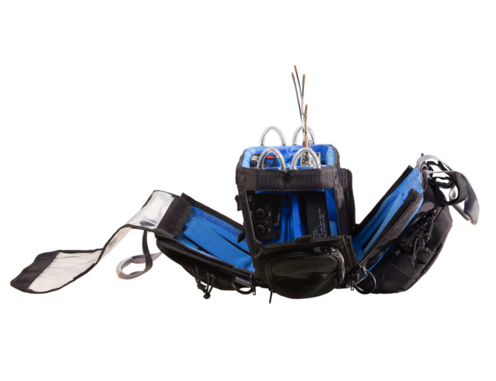 The bag comes with two handles and a padded shoulder strap. The bag can be accessed from all 6 directions, which helps the operator to arrange and easily access the equipment inside. There are two extra pockets: one at the front for storing headsets, cables, batteries, etc, and a back pocket which can hold a small battery.