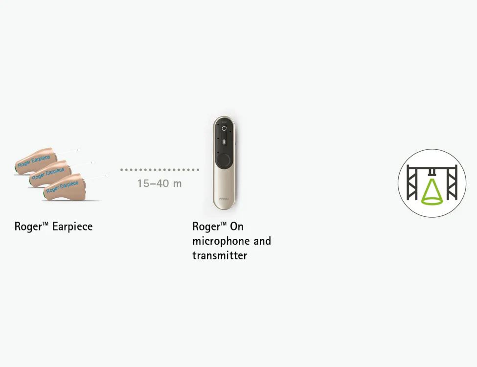 - transmitter with built-in microphones for direct use with Roger Earpiece
