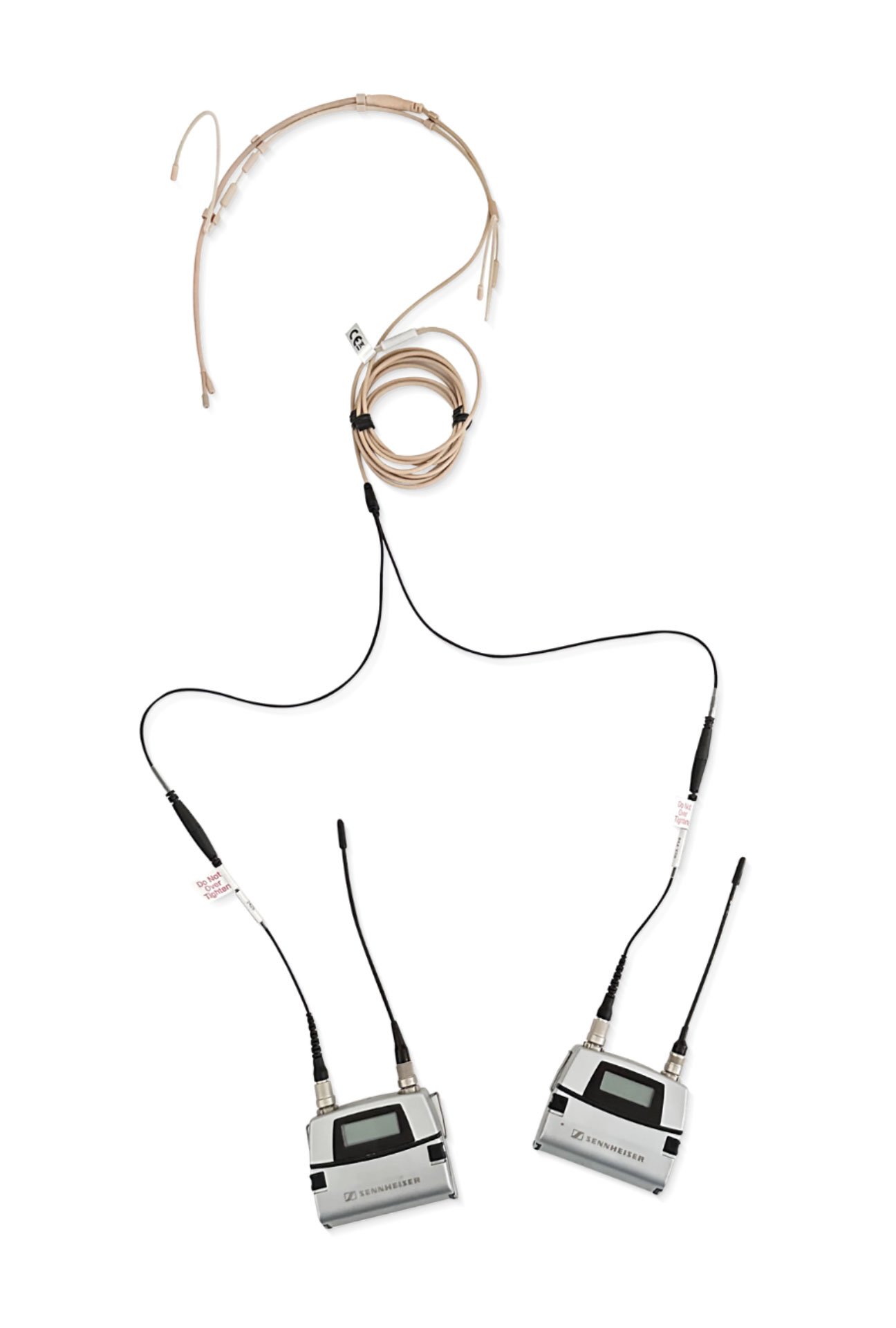 The headset microphone offers built-in microphone redundancy with the convenience of a single cable. Elements are factory matched to a near identical ±0.5 dB difference—and both elements are waterproof. The mic elements are offset to reduce mass and effectuate a sleek profile. Mic cable splits approximately nine inches above connection to the body-packs to allow ample room for separation of the transmitters.