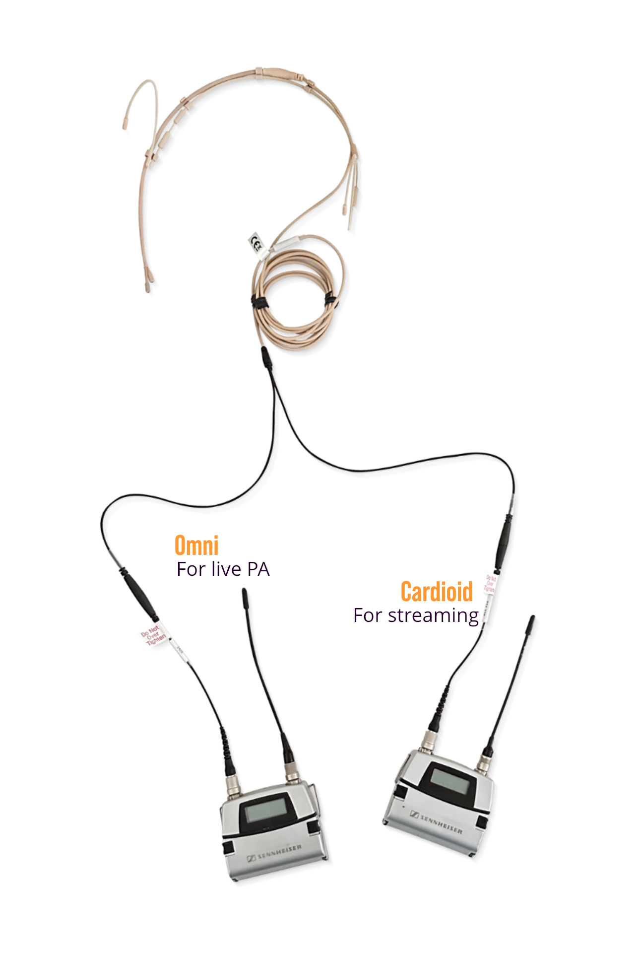 The CX2 headset microphone has a patented design that supports audio feeds in both omni and directional pickup patterns—simultaneously. The elements are offset creating a seamless appearance of a single microphone. There's no unnecessary bulk or doubling up on cables. The mic cable splits approximately nine inches above connection to the body-packs to allow ample room for separation of two transmitters. Headset can be adjusted to be worn over either the left or right ear.