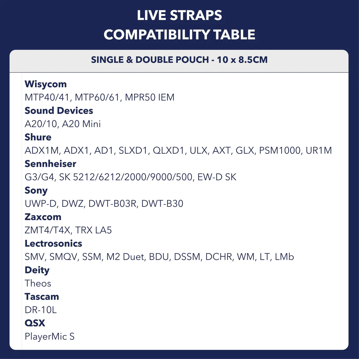 The Live Straps are designed for easy & fast access to a transmitter inside the pouch. We achieve this by making the pouches 1cm wider than the regular straps - they measure 9cm across rather than 8cm. This makes the pouches wider and easier to get large IEM or Transmitter units inside.