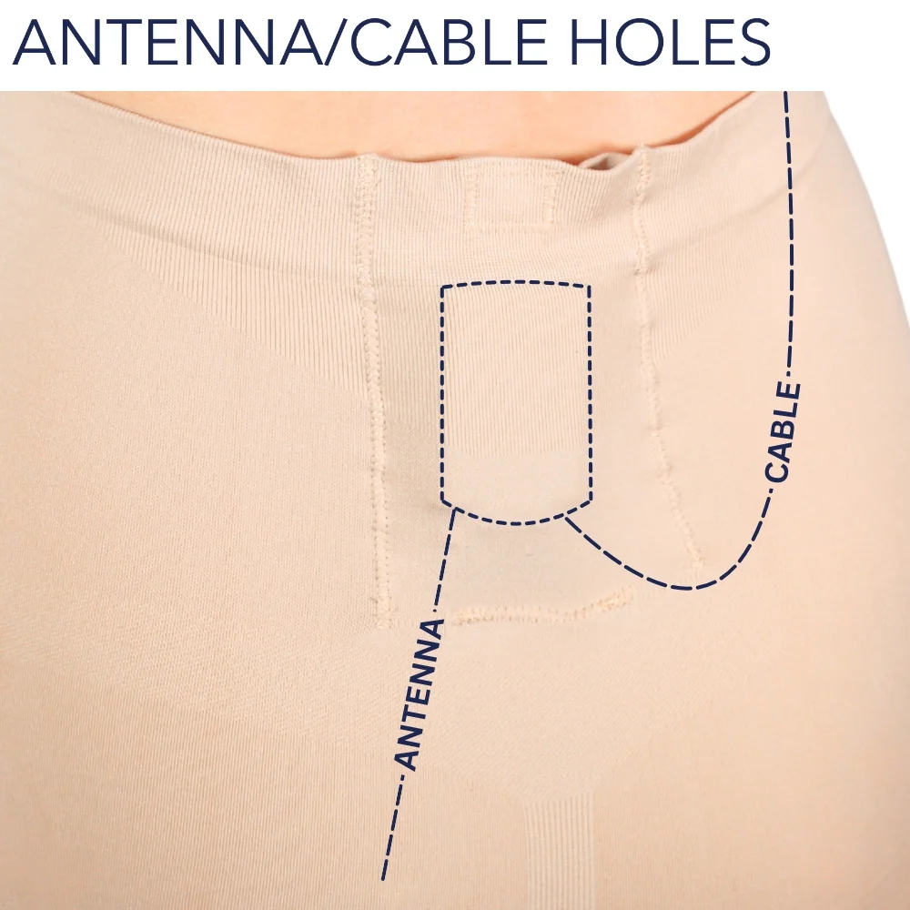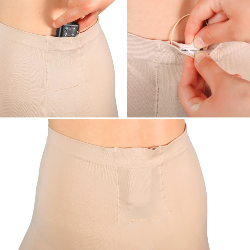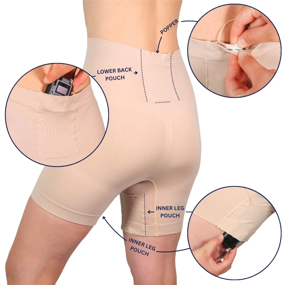 Form fitting shape wear for women with 3 built in pouches. BEIGE. Comfortable, low profile & very handy under tight outfits for live performance, TV & Feature Films.